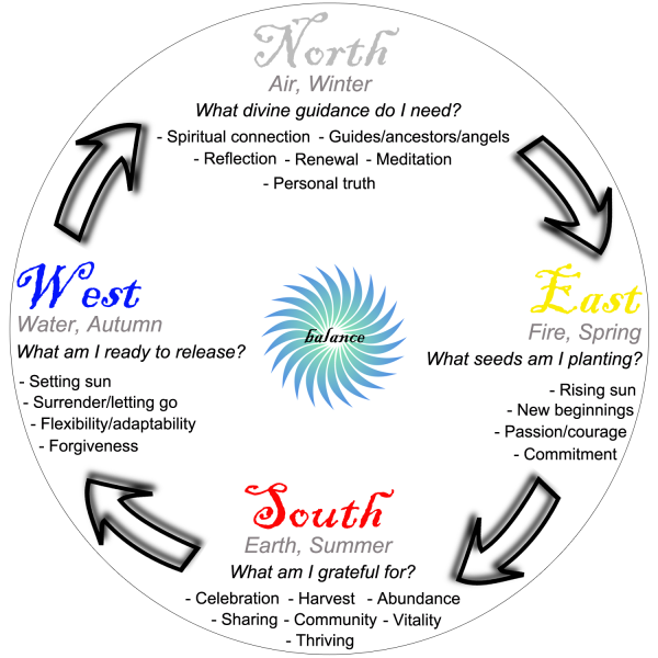 This direction is represented by the setting sun (conscious closure), autumn and the water element (releasing old emotions), as well as the snake (shedding what is no longer needed).